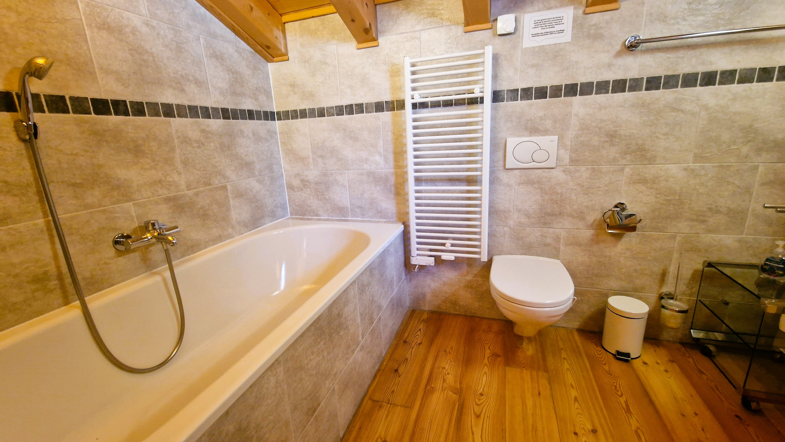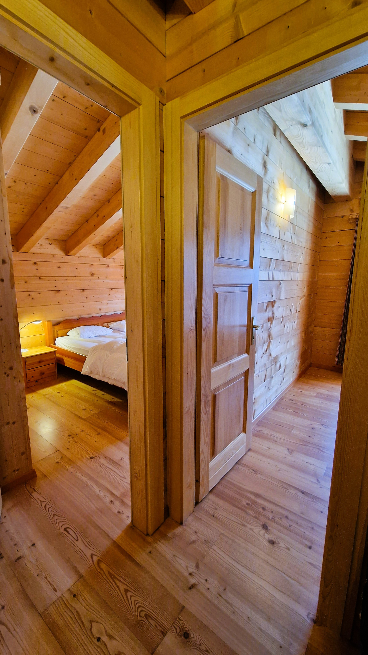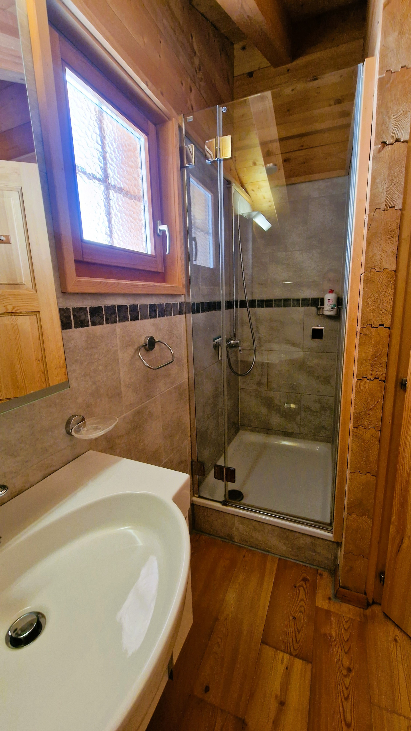 The chalet has 3 bedrooms, a bathroom with a bath and shower