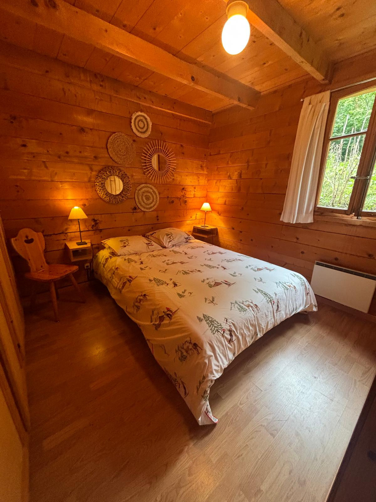 Le chalet est équipé de tout le confort nécessaire pour un séjour agréable. Il comprend une salle de bains avec une douche et toilettes. Le chauffage est assuré par des radiateurs électriques.